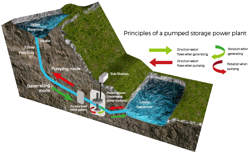 - Powerhouse: facility with one or more pump/turbine and motor/generator assemblies that allow pumping water into the upper reservoir at off-peak hours, and discharging water into the lower reservoir.